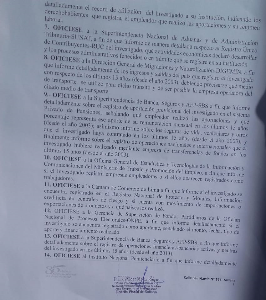 dispuso varias diligencias en la mencionada investigación por el delito de lavado de activos pero el fiscal NO SOLICITO al juez competente EL LEVANTAMIENTO DEL SECRETO BANCARIO, DE LA RESERVA TRIBUTARIA Y BURSÁTIL Y DEL SECRETO DE LAS COMUNICACIONES DEL DENUNCIADO JUEZ Y DE SUS PARIENTES por lo que el denunciante recurrió al despacho del cuestionado fiscal Frank Roque Malca para ampliar la denuncia a los delitos de cohecho y defraudación tributaria en la modalidad de ocultamiento de ingresos económicos obtenidos por la corrupción judicial que se interpuso en contra del mal juez